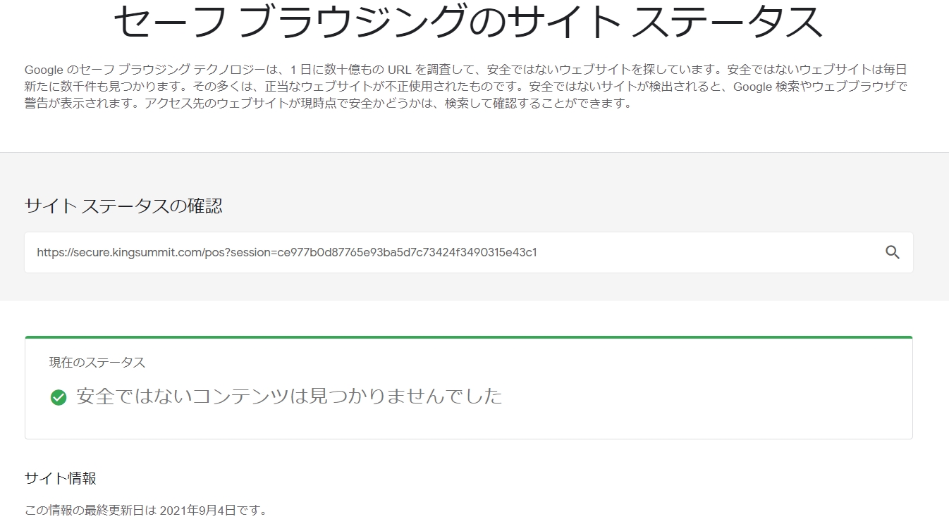 安全ではないコンテンツは見つかりませんでした」と表示されており、安全なサイトであることがわかります。